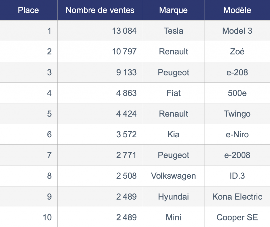 Ce classement 2021 des ventes de voitures électriques en France met en lumière la supériorité flagrante de certains modèles. La Tesla Model 3, la Renault Zoé et la Peugeot e-208 sont largement devant la Fiat 500e qui compte près de deux fois moins de ventes que Peugeot avec sa citadine électrique.